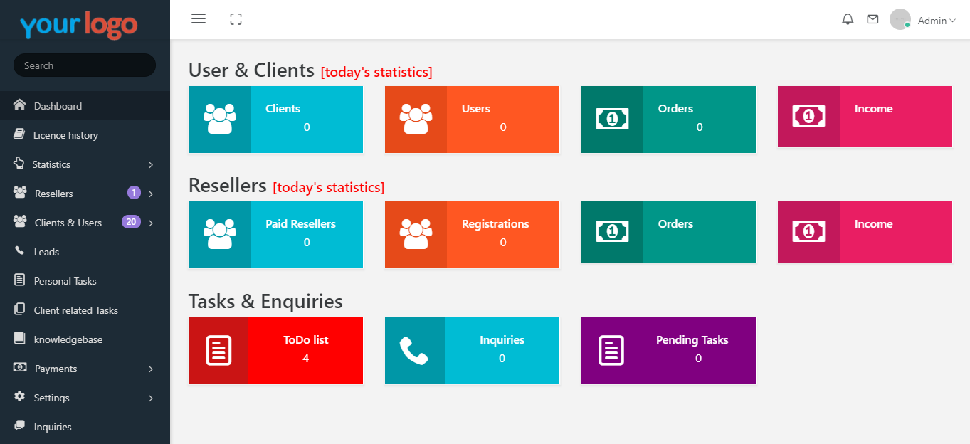 Access statistics in regards to users, clients, resellers, licences purchased & sold, income generated ans so on.