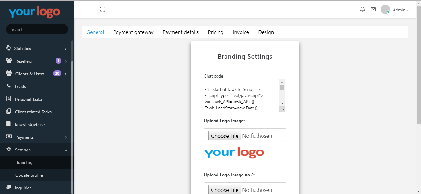 You can upload your logos, contact details, chat information, payment details and other information from the branding settings. more customization suggestions are welcome.